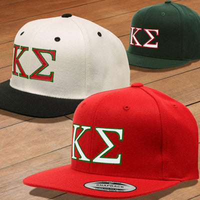 This Yupoong cap comes with a classic snapback closure and a flat visor and comes with the Kappa Sigma greek symbols embroidered on the front. This cap features 2-color embroidered letters. One size.
