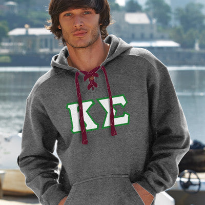 This sport laced hockey hooded sweatshirt comes with the Kappa Sigma Greek symbols in 4-inch twill sewn-on letters across the chest. Comes with white laces and an extra set in the color of your choice! This is a Unisex/Men's sized garment - if you have any questions please click on sizing chart below.