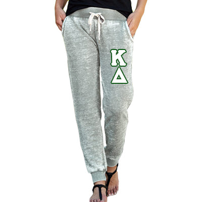 Sorority Zen Jogger Pants from J. America come with 4-inch twill sewn-on letters going down the left leg. Pants are made in ladies sizes.