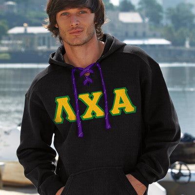 This sport laced hockey hooded sweatshirt comes with the Lambda Chi Alpha Greek symbols in 4-inch twill sewn-on letters across the chest. Comes with white laces and an extra set in the color of your choice! This is a Unisex/Men's sized garment - if you have any questions please click on sizing chart below.