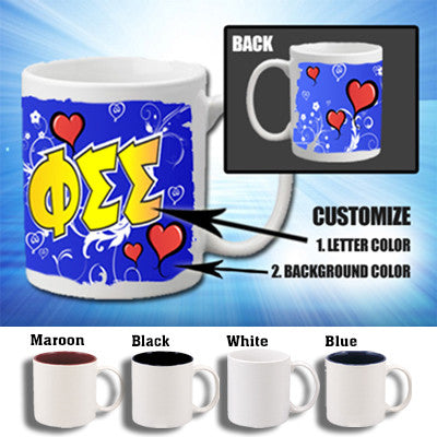 This Lovely Sorority Coffee Mug can only be found here at Something Greek. Mug comes with your Sororities' Greek Symbols in the color of your choice. You can also select a custom Background color as well and one of four colors for inside the mug. Click on the Print Colors link below to view all the colors. The other colors in the design will stay as shown. Please select your organization above - we will only use the Greek Symbols on the mug.