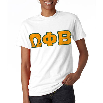 100% cotton 5.3oz preshrunk Gildan Unisex/Men's Sized T-Shirt comes with Omega Phi Beta in Greek Twill letters sewn on the front. Double-needle stitching throughout; seamless topstitched collar; taped neck and shoulders. Rush service is available for a fee of 20% of total.