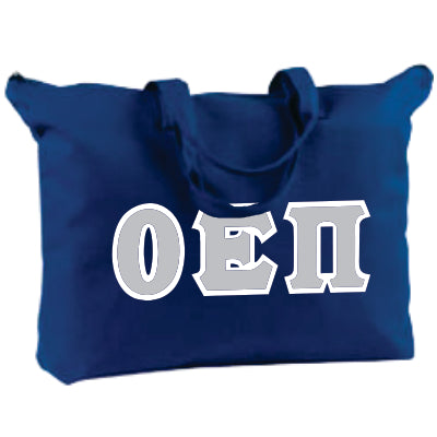 Customize this Omicron Epsilon Pi shoulder tote bag with your Greek letters. Perfect for around the campus! Sorority letters measure 4-inches in height and can be personalized with your choice of pattern and border.