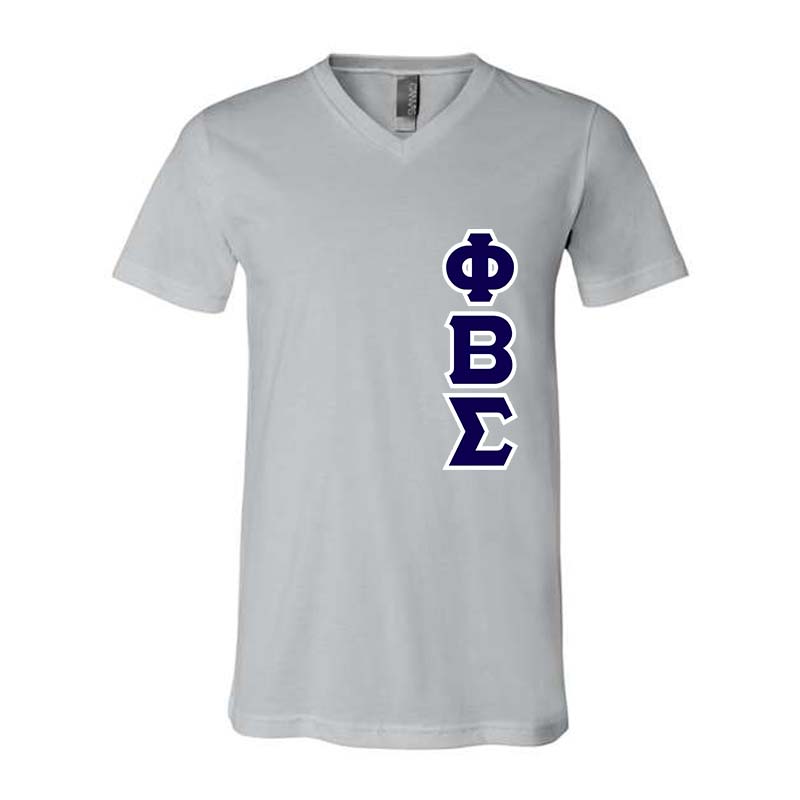 Customize our best-selling Greek Fraternity V-Neck Shirt by Bella + Canvas with your Phi Beta Sigma letters! Choose from over 450+ different Greek letter twill designs, colors and patterns. The custom twill Greek letters measure 4” in height and are sewn vertically down the left side.