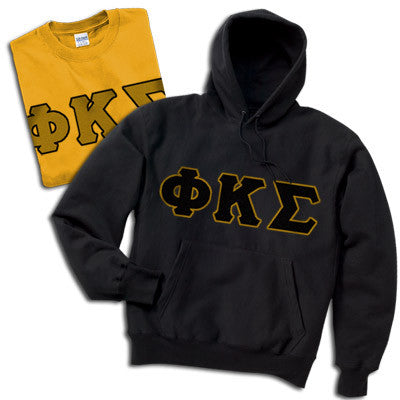 Phi Kappa Sigma hoody / t-shirt pack comes with 4 inch twill Greek letters sewn on the front of both garments. Hoody: Gildan 7.75oz unisex/men's sized hooded sweatshirt, 50% cotton and 50% polyester. T-Shirt: Gildan 5.3oz unisex/men's sized t-shirt, 100% cotton, preshrunk. Rush service is available for a fee of 15% of the total price, this service can be selected during checkout.