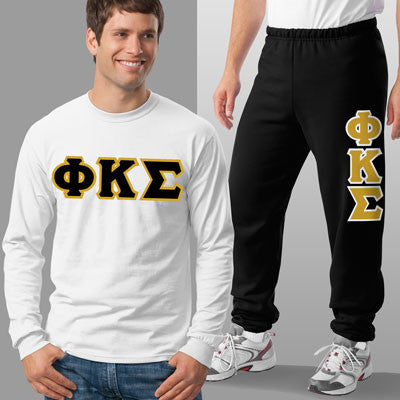 This package comes with the Gildan longsleeve with 4 inch twill letters going across the chest and Jerzees sweatpants with 4 inch twill letters going down the left leg. Both items will come with the Phi Kappa Sigma greek symbols.