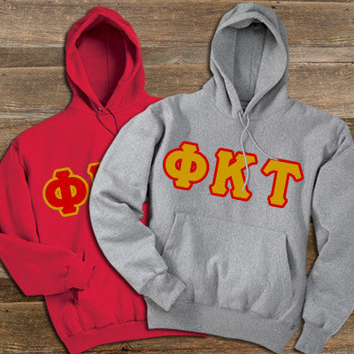 Phi Kappa Tau hoodies come with 4 inch twill Greek letters sewn on the front. Gildan 7.75oz unisex/men's sized hooded sweatshirts, 2 for this low price! 50% cotton and 50% polyester. Rush service is available for a fee of 15% of the total price, this service can be selected during checkout.