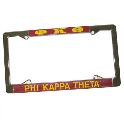 Phi Kappa Theta license plate frame comes as shown. These frames are metal. Rush service is available for 15% of the total price, and can be selected during checkout.