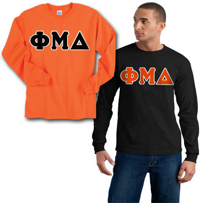 This Phi Mu Delta longsleeve package comes with two longsleeve t-shirts that have Phi Mu Delta Greek Symbols in 4-inch twill sewn-on letters on the front. These shirts are unisex/men's sized.