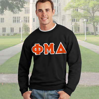 This Gildan crewneck comes with 4-inch twill sewn-on Phi Mu Delta greek symbols on the front.