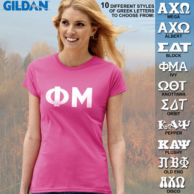This Gildan ladies' tee is made up of the brand new Soft Style material and comes with the Phi Mu Greek symbols printed across the front in 3-inches in the font of your choice. This is a printed item and does NOT have twill letters.