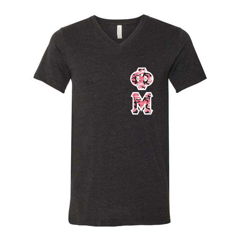 Customize our best-selling Greek Sorority V-Neck Shirt by Bella + Canvas with your Phi Mu letters! Choose from over 450+ different Greek letter twill designs, colors and patterns. The custom twill Greek letters measure 4” in height and are sewn vertically down the left side.