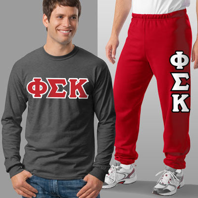 This package comes with the Gildan longsleeve with 4 inch twill letters going across the chest and Jerzees sweatpants with 4 inch twill letters going down the left leg. Both items will come with the Phi Sigma Kappa greek symbols.