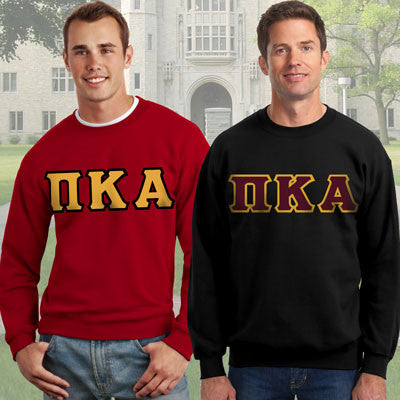 Buy 2 9-ounce crewneck Pi Kappa Alpha Gildan sweatshirts and save money! Crewneck sweatshirts will come with 4-inch Pi Kappa Alpha twill sewn-on letters. Sweatshirts are unisex/men's sized.