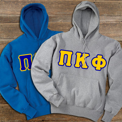 Pi Kappa Phi hoodies come with 4 inch twill Greek letters sewn on the front. Gildan 7.75oz unisex/men's sized hooded sweatshirts, 2 for this low price! 50% cotton and 50% polyester. Rush service is available for a fee of 15% of the total price, this service can be selected during checkout.