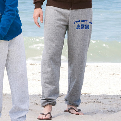 Property Of... Printed Fraternity Sweatpants come with your Fraternities' Greek letters printed in the font as shown here on the left leg.