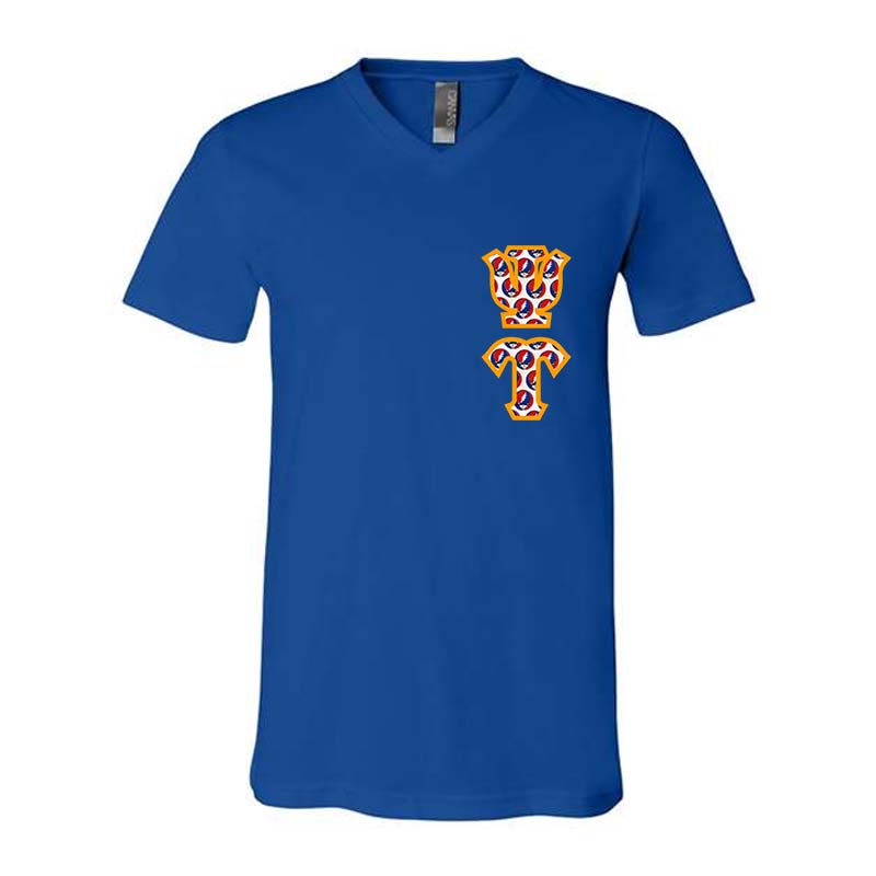 Customize our best-selling Greek Fraternity V-Neck Shirt by Bella + Canvas with your Psi Upsilon letters! Choose from over 450+ different Greek letter twill designs, colors and patterns. The custom twill Greek letters measure 4” in height and are sewn vertically down the left side.