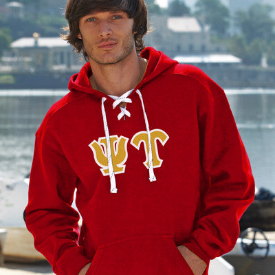 This sport laced hockey hooded sweatshirt comes with the Psi Upsilon Greek symbols in 4-inch twill sewn-on letters across the chest. Comes with white laces and an extra set in the color of your choice! This is a Unisex/Men's sized garment - if you have any questions please click on sizing chart below.