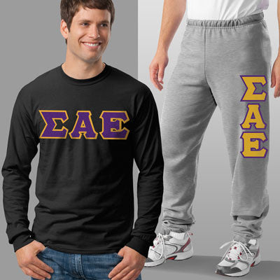 This package comes with the Gildan longsleeve with 4 inch twill letters going across the chest and Jerzees sweatpants with 4 inch twill letters going down the left leg. Both items will come with the Sigma Alpha Epsilon greek symbols.