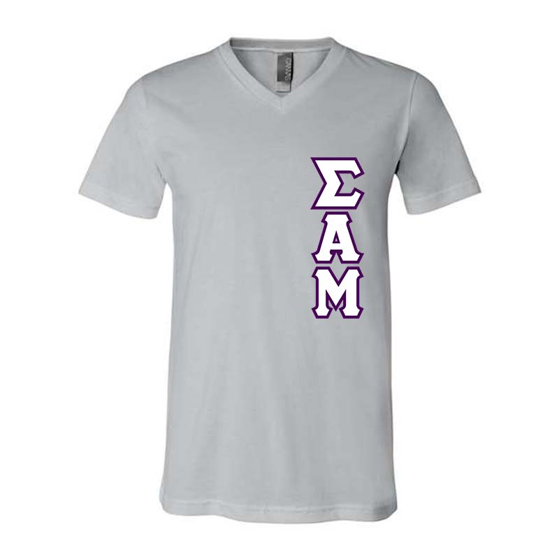 Customize our best-selling Greek Fraternity V-Neck Shirt by Bella + Canvas with your Sigma Alpha Mu letters! Choose from over 450+ different Greek letter twill designs, colors and patterns. The custom twill Greek letters measure 4” in height and are sewn vertically down the left side.