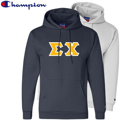 Get 2 of our best selling Champion Sweatshirts for a special discounted price. Sweatshirts can both be customized and will come with Sigma Chi Greek letters sewn on the front in 4-inch twill. Champion Unisex/Men's Sized 9-ounce hooded fleece sweatshirt. 50% cotton, 50% polyester; Lycra enhanced trim; two-ply hood; front pouch with bartacks for durability; ribbed waistband; C logo at left cuff. Rush service is available for 15% of the total price, this service can be selected during checkout.