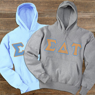 Sigma Delta Tau hoodies come with 4 inch twill Greek letters sewn on the front. Gildan 7.75oz unisex/men's sized hooded sweatshirts, 2 for this low price! 50% cotton and 50% polyester. Rush service is available for a fee of 15% of the total price, this service can be selected during checkout.