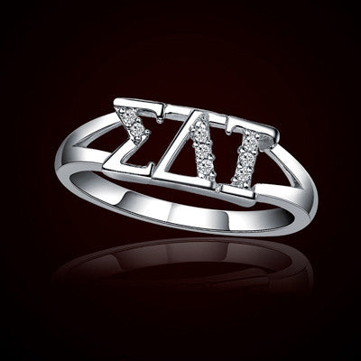 This Sterling Silver ring is made specifically for Sigma Delta Tau Sorority. The ring comes with Lab Created Diamonds on the Greek symbols. Ring is available in sizes 5-8. Please contact customer service to see if the size you are looking for is in stock or not. Rush service is available on this item.