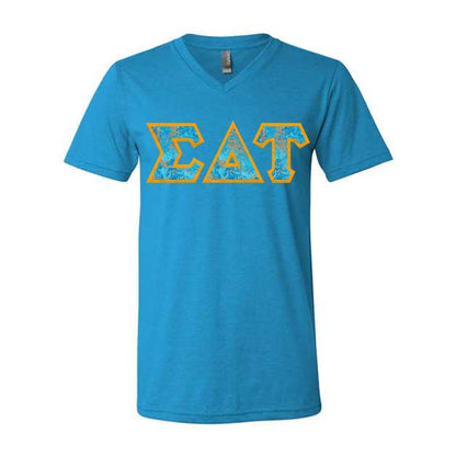Customize our best-selling 4-inch Greek Letter V-Neck Shirt by Bella + Canvas with your Sigma Delta Tau sorority letters! Choose from over 450+ different Greek letter twill designs, colors and patterns. The custom twill Greek letters measure 4-inches in height and are sewn horizontally across the chest.