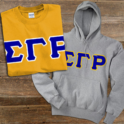 Sigma Gamma Rho hoody / t-shirt pack comes with 4 inch twill Greek letters sewn on the front of both garments.Hoody: Gildan 7.75oz unisex/men's sized hooded sweatshirt, 50% cotton and 50% polyester. T-Shirt: Gildan 5.3oz unisex/men's sized t-shirt, 100% cotton, preshrunk. Rush service is available for a fee of 20% of the total price, this service can be selected during checkout.