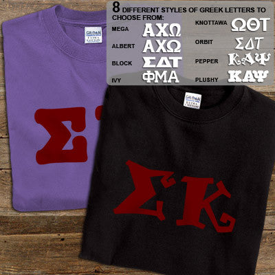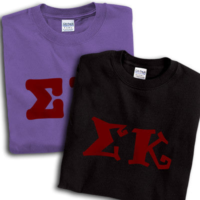 Get 2 Sigma Kappa printed t-shirts for almost the same price as getting one! 8 fonts and multiple colors to choose from. Gildan 5.3oz. 100% cotton, preshrunk t-shirts. Double-needle stitching throughout, seamless topstitched collar, taped neck and shoulders. Ash color is 99% cotton, 1% polyester, Sports Grey color is 90% cotton, 10% polyester, Heather Cardinal, Dark Heather and Heather Indigo are 50% cotton and 50% polyester. Rush service is available for 20% of the total price, this option is available during checkout. This is a PRINTED item. This item does NOT have sewn on twill letters. Any questions, please contact customer service.