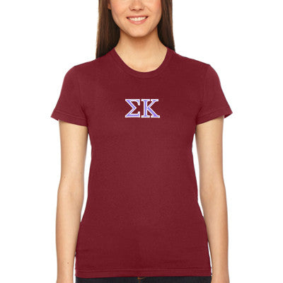 Sigma Kappa ladies fitted tee comes with your Greek letters embroidered on the center chest. 100% superfine cotton, 4.8 oz. 3/4 inch set-in collar; shoulder-to-shoulder taping; 3/4 inch sleeve and bottom hem. Rush service is available for 20% of the total price, this option is available during checkout. Comes with your choice of two color embroidery.