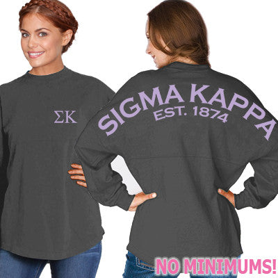 New No Minimum Game Day Sigma Kappa Sorority Jerseys. Order just one for yourself or order in bulk for your whole chapter and save money. Jersey comes with Sigma Kappa written out as shown on the back of the jersey and then a custom line of text below that. You can customize the second line with your Established Date or Chapter if you would like. Also there is an option to add your Sigma Kappa Sorority Greek Symbols to the left chest if you would like as well. If you do select Yes then the Greek Symbols will be printed in the same color as you select for the back. Glitter Prints are available Free of Charge! Jersey is unisex/men's sized and is printed.