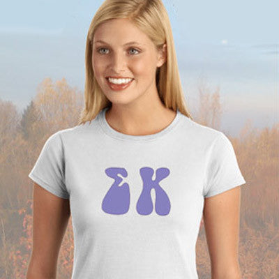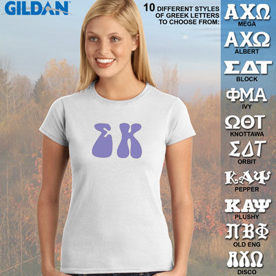This Gildan ladies' tee is made up of the brand new Soft Style material and comes with the Sigma Kappa Greek symbols printed across the front in 3-inches in the font of your choice. This is a printed item and does NOT have twill letters.