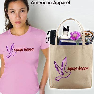 Sigma Kappa Mascot Printed Tee and Tote Package comes as shown. Gildan Fine Jersey Short Sleeve Tee will be used as the shirt. You pick the shirt color, the size, the mascot color and then the text color. The Sigma Kappa mascot shown in the picture will be used both on the shirt and the tote.