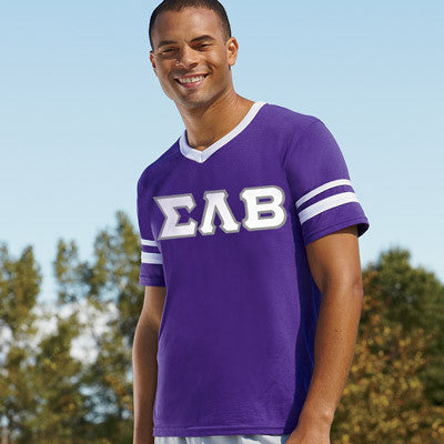 This Greek striped sleeve v-neck jersey t-shirt comes with Sigma Lambda Beta greek symbols on the front in 4-inch twill sewn-on letters. This is a UNISEX/MEN'S SIZED tee.