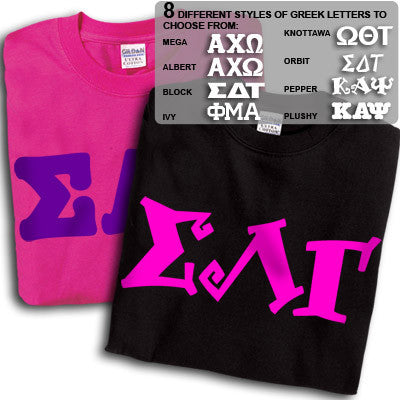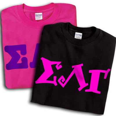 Get 2 Sigma Lambda Gamma printed t-shirts for almost the same price as getting one! 8 fonts and multiple colors to choose from. Gildan 5.3oz. 100% cotton, preshrunk t-shirts. Double-needle stitching throughout, seamless topstitched collar, taped neck and shoulders. Ash color is 99% cotton, 1% polyester, Sports Grey color is 90% cotton, 10% polyester, Heather Cardinal, Dark Heather and Heather Indigo are 50% cotton and 50% polyester. Rush service is available for 20% of the total price, this option is available during checkout. This is a PRINTED item. This item does NOT have sewn on twill letters. Any questions, please contact customer service.