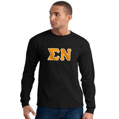 This Sigma Nu Fraternity longsleeve comes with 4-inch twill sewn-on letters for Sigma Nu across the front of the shirt. You can choose the color of the longsleeve, size and the letter and border combinations.