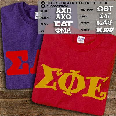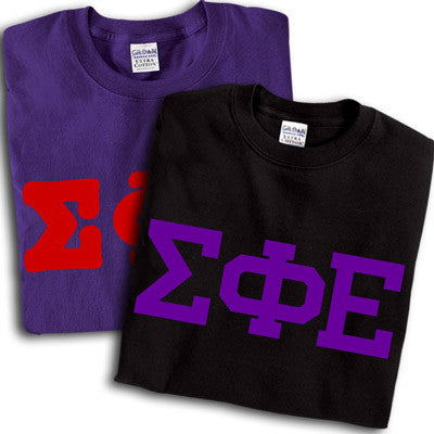 Get 2 Sigma Phi Epsilon printed t-shirts for almost the same price as getting one! 8 fonts and multiple colors to choose from. Gildan 5.3oz. 100% cotton, preshrunk t-shirts. Double-needle stitching throughout, seamless topstitched collar, taped neck and shoulders. Ash color is 99% cotton, 1% polyester, Sports Grey color is 90% cotton, 10% polyester, Heather Cardinal, Dark Heather and Heather Indigo are 50% cotton and 50% polyester. Rush service is available for 20% of the total price, this option is available during checkout. This is a PRINTED item. This item does NOT have sewn on twill letters. Any questions, please contact customer service.