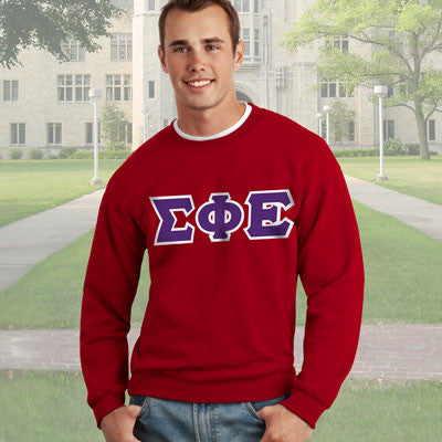 This Gildan crewneck comes with 4-inch twill sewn-on Sigma Phi Epsilon greek symbols on the front.