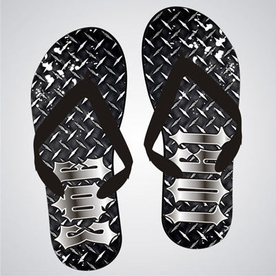 Brand New Product Exclusive To Something Greek, these Diamond Plate Printed Flip-Flops come with the Sigma Phi Epsilon greek symbols on the left flip flop as shown and the right flip flop will display the date you input. Comes in sizes Small - XL, and they are made of rubber.