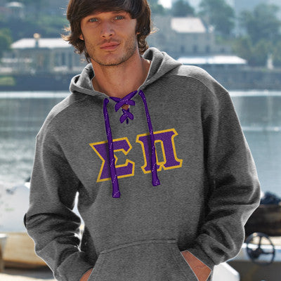 This sport laced hockey hooded sweatshirt comes with the Sigma Pi Greek symbols in 4-inch twill sewn-on letters across the chest. Comes with white laces and an extra set in the color of your choice! This is a Unisex/Men's sized garment - if you have any questions please click on sizing chart below.