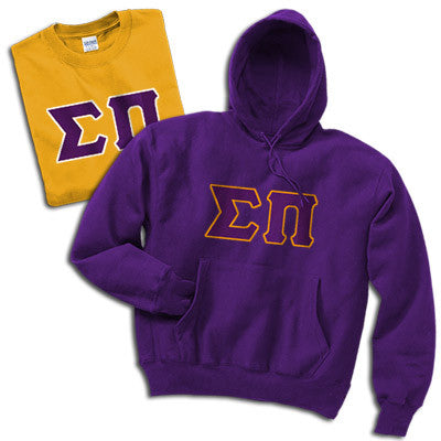 Sigma Pi hoody / t-shirt pack comes with 4 inch twill Greek letters sewn on the front of both garments. Hoody: Gildan 7.75oz unisex/men's sized hooded sweatshirt, 50% cotton and 50% polyester. T-Shirt: Gildan 5.3oz unisex/men's sized t-shirt, 100% cotton, preshrunk. Rush service is available for a fee of 20% of the total price, this service can be selected during checkout.