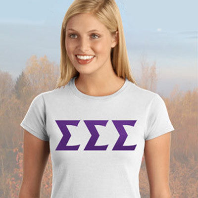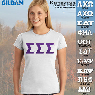 This Gildan ladies' tee is made up of the brand new Soft Style material and comes with the Sigma Sigma Sigma Greek symbols printed across the front in 3-inches in the font of your choice. This is a printed item and does NOT have twill letters.