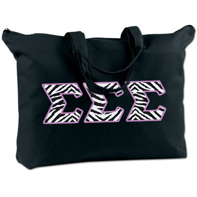 Customize this Sigma Sigma Sigma shoulder tote bag with your Greek letters. Perfect for around the campus! Sorority letters measure 4-inches in height and can be personalized with your choice of pattern and border.