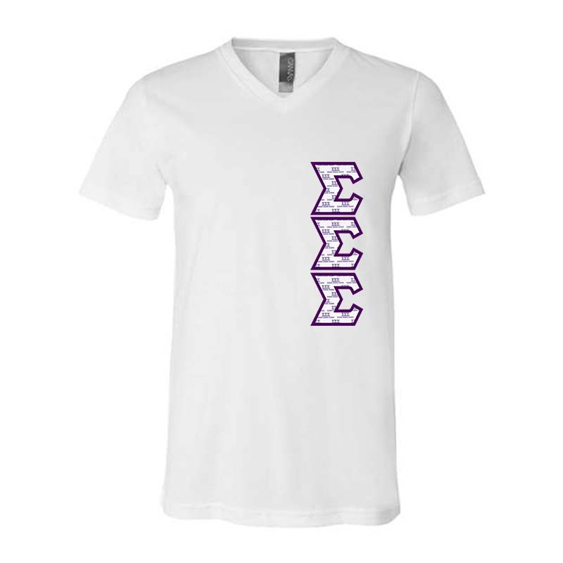 Customize our best-selling Greek Sorority V-Neck Shirt by Bella + Canvas with your Sigma Sigma Sigma letters! Choose from over 450+ different Greek letter twill designs, colors and patterns. The custom twill Greek letters measure 4” in height and are sewn vertically down the left side.