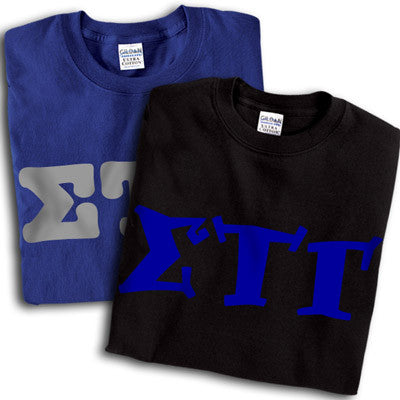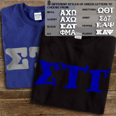 Get 2 Sigma Tau Gamma printed t-shirts for almost the same price as getting one! 8 fonts and multiple colors to choose from. Gildan 5.3oz. 100% cotton, preshrunk t-shirts. Double-needle stitching throughout, seamless topstitched collar, taped neck and shoulders. Ash color is 99% cotton, 1% polyester, Sports Grey color is 90% cotton, 10% polyester, Heather Cardinal, Dark Heather and Heather Indigo are 50% cotton and 50% polyester. Rush service is available for 20% of the total price, this option is available during checkout. This is a PRINTED item. This item does NOT have sewn on twill letters. Any questions, please contact customer service.
