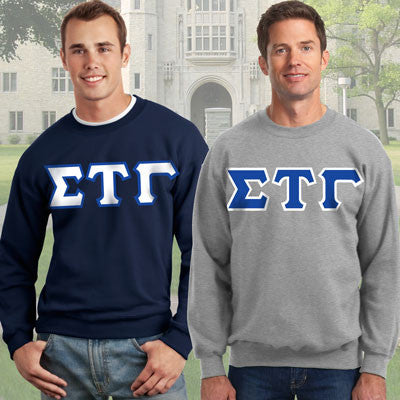 Buy 2 9-ounce crewneck Sigma Tau Gamma Gildan sweatshirts and save money! Crewneck sweatshirts will come with 4-inch Sigma Tau Gamma twill sewn-on letters. Sweatshirts are unisex/men's sized.