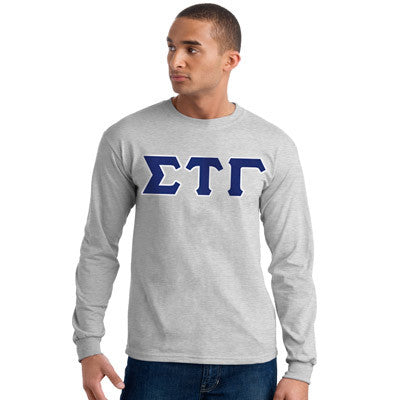 This Sigma Tau Gamma Fraternity longsleeve comes with 4-inch twill sewn-on letters for Sigma Tau Gamma across the front of the shirt. You can choose the color of the longsleeve, size and the letter and border combinations.