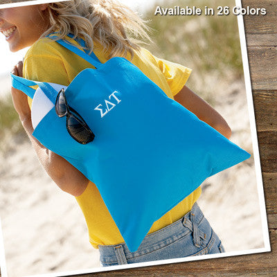 Bag Comes In 26 Colors. You can collect them all or just pick your favorite color. Bag comes with your organizations' greek letters embroidered on it, in the color of your choosing. For an extra $3.00, you can have 2-color embroidered letters. Dimensions of bag are: 13 3/4 inch W x 14 3/4 inch H, and is 7.5 ounces. Rush service is available for 20% of the total price, this option is available during checkout.