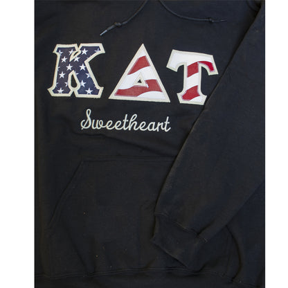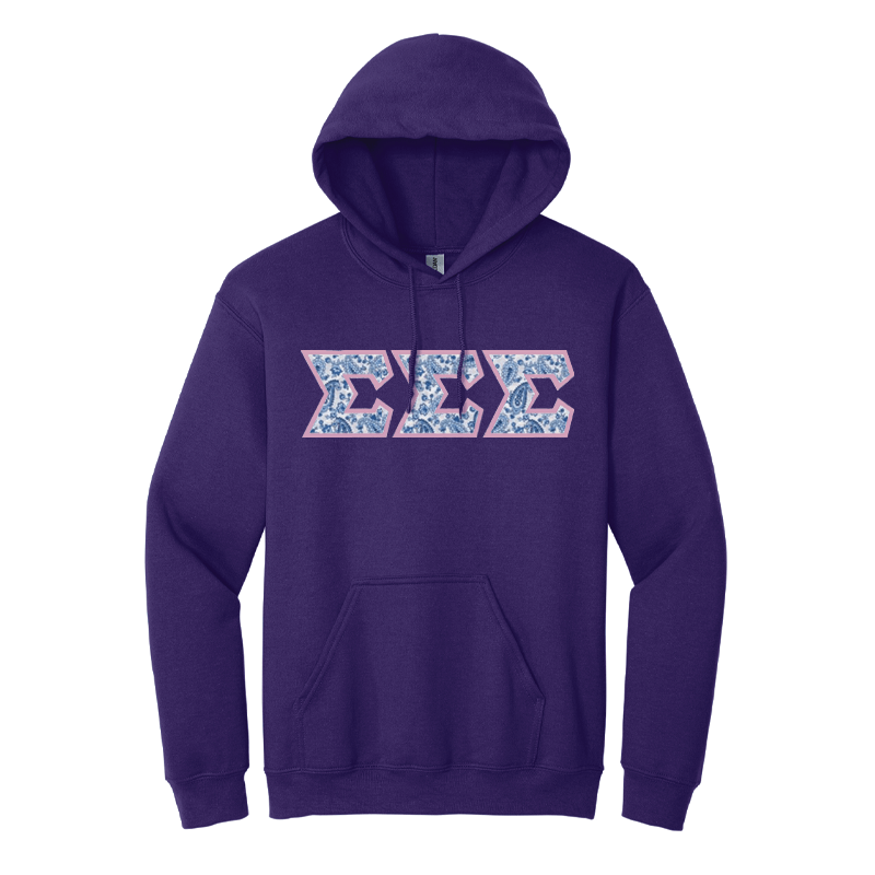 Our best selling sorority sweatshirt since 1989 not only features great quality but now it has a great Low Price! Gildan unisex/men's sizing hooded sweatshirt comes with 4-inch twill sewn-on letters across the front. Please write out the full Sorority name below - we will only use the Greek Symbols on the hoody.